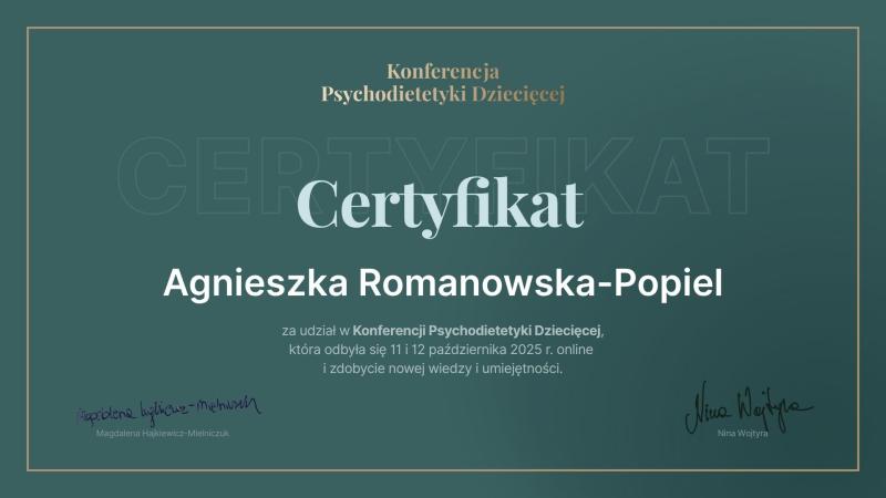 Nazywam się Agnieszka Romanowska-Popiel i jestem magistrem żywienia człowieka oraz dietetyki. Ukończyłam także studia podyplomowe z zakresu dietetyki pediatrycznej oraz żywienia i wspomagania dietetycznego w sporcie. Posiadam również certyfikaty specjalistki w kilku obszarach, takich jak psychodietetyka, diety dla płodności, żywienie i suplementacja w PCOS, dieta przy insulinooporności oraz edukacja w zakresie cukrzycy.
